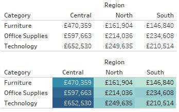 A quick way to turn a table in to visual chart is the use of highlight tables. Or as Shaffer, Wexler and Cotgreave suggest “Adding a colour encoding to your tables can transform them into highly visual views that also enable exact look up of any value.”